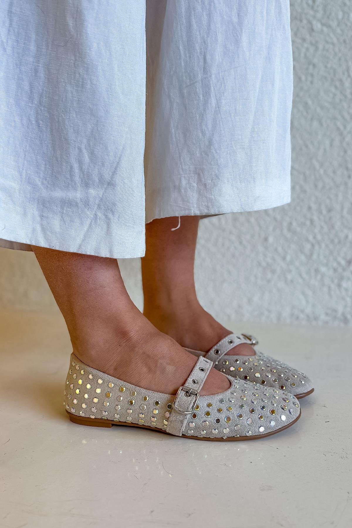 Klon Bej Süet Taş Detaylı Kadın Babet