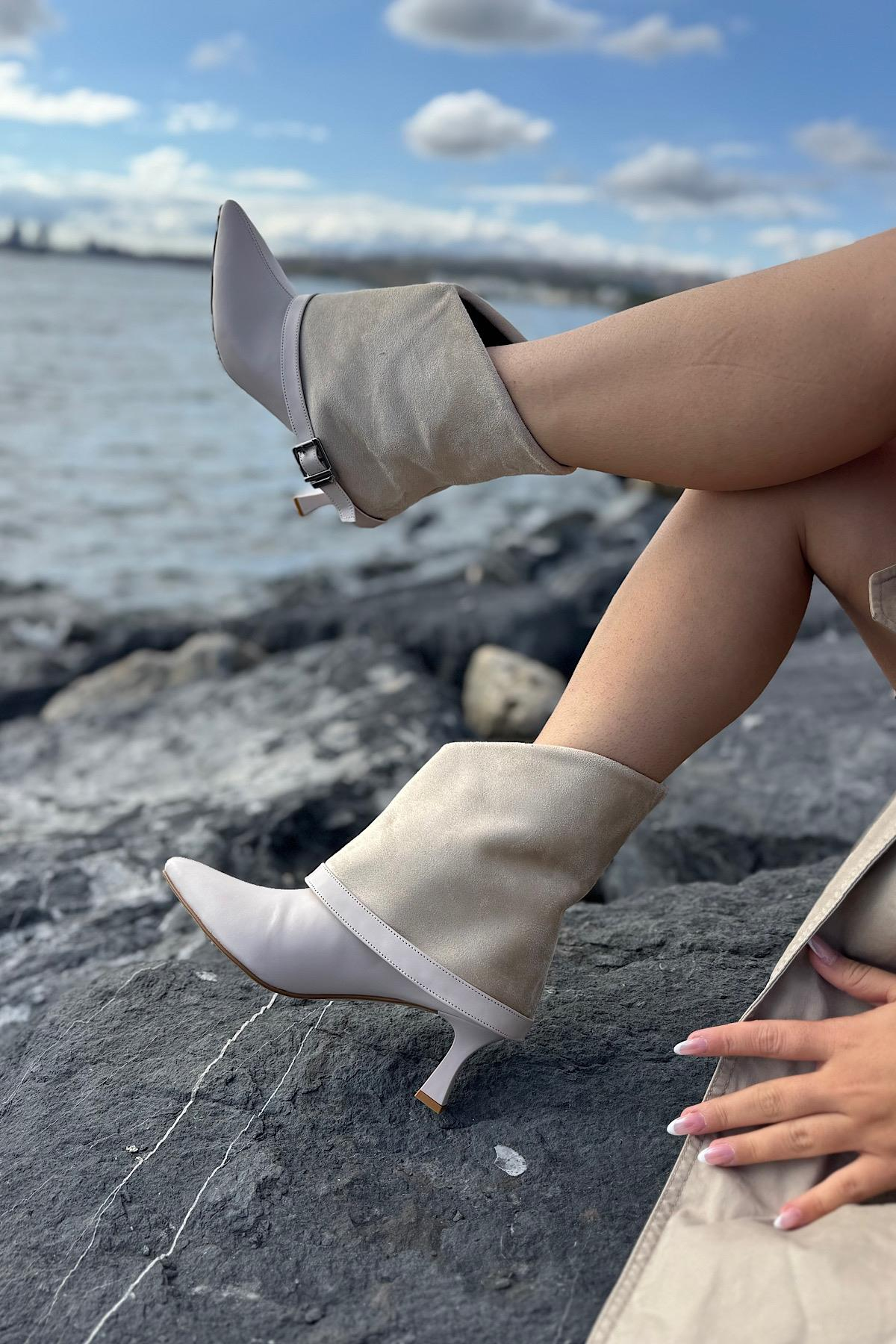 Mikron Bej Cilt Kemer Detaylı Kadın Topuklu Bot
